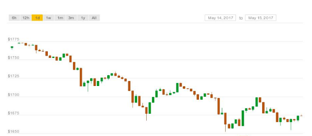 O preço da bitcoin sofreu esta queda depois de quase duplicar em menos de dois meses, de acordo com dados do índice de preços Bitcoin. Em meio ao forte interesse dos investidores, os preços do bitcoin atingiram o máximo histórico de US $ 1,848.75 dólares no dia 11 de maio, mas desde então caíram mais de 10%.